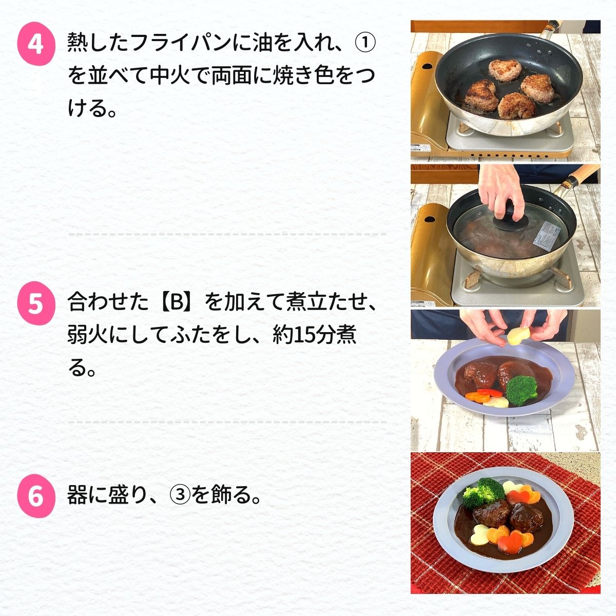 ①ひき肉に【A】を加えて練り混ぜ、4等分にしてハート形にととのえ、薄力粉をまぶす。