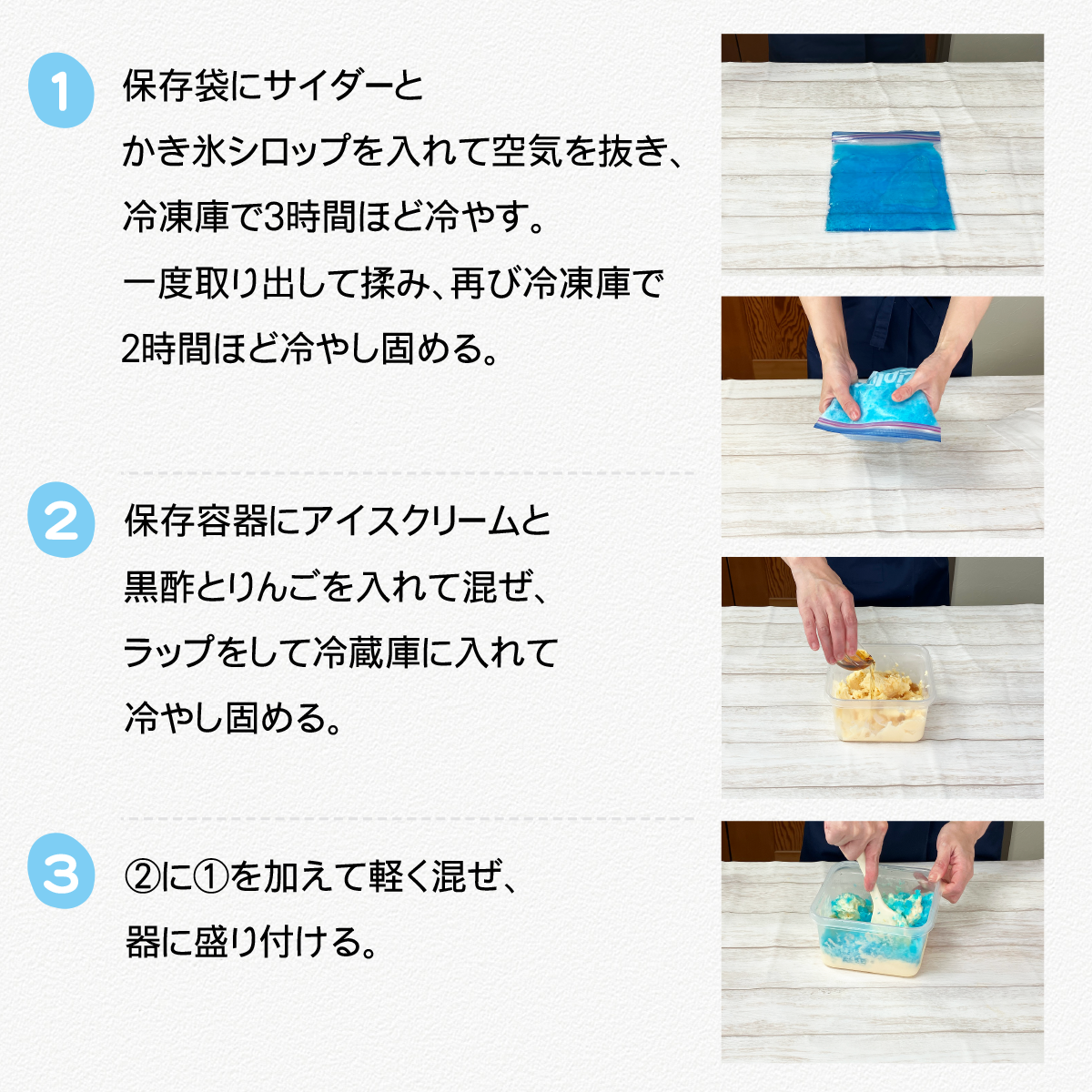 ② 保存容器にアイスクリームと黒酢とりんごを入れて混ぜ、ラップをして冷蔵庫に入れて冷やし固める。