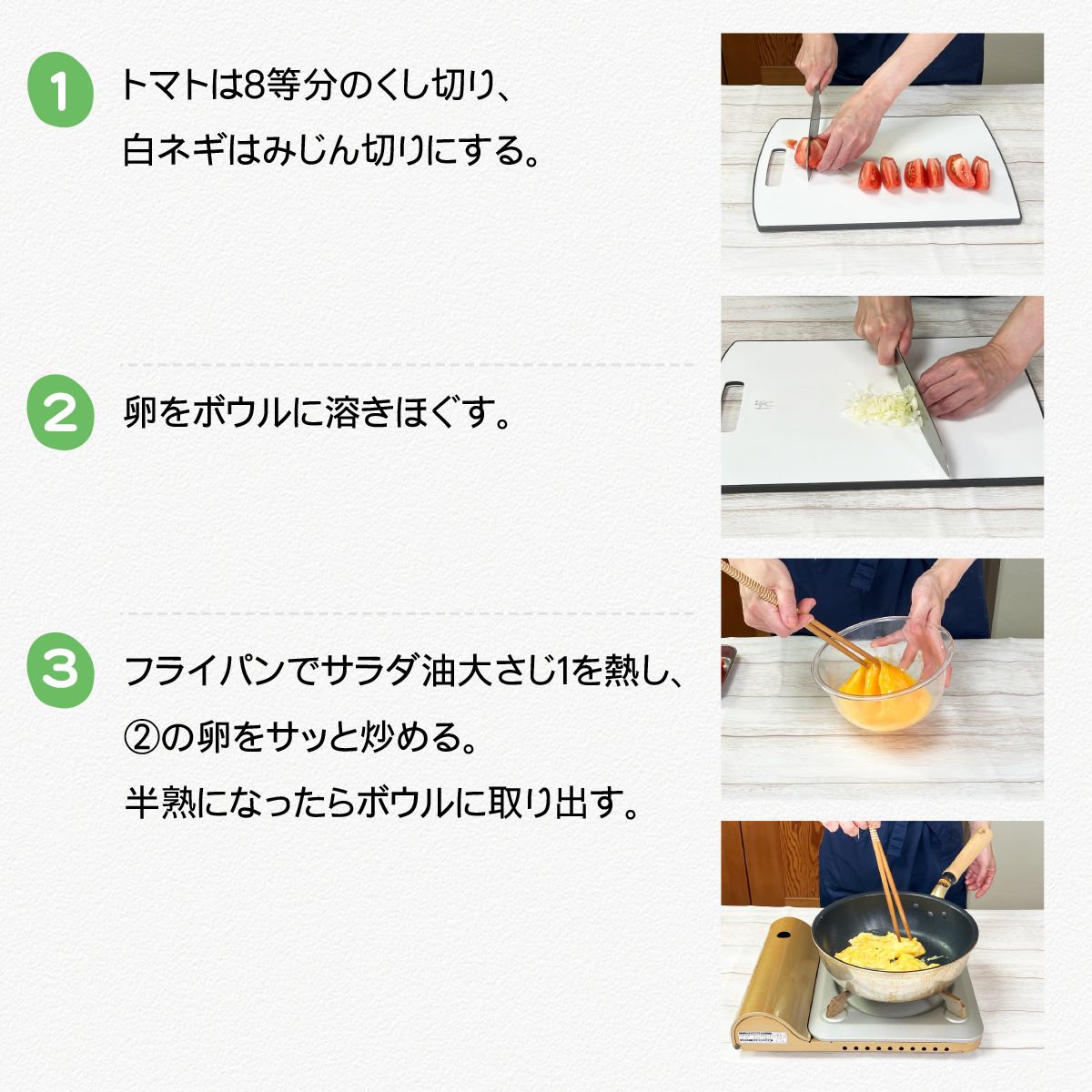 ① トマトは8等分のくし切り、白ネギはみじん切りにする。