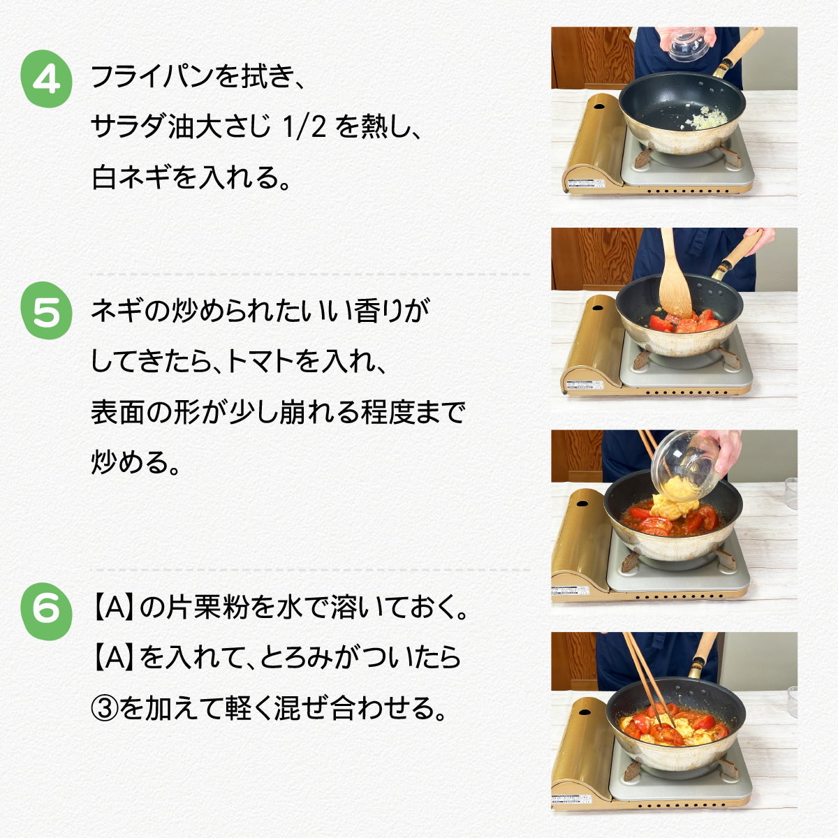 ⑤ ネギの炒められたいい香りがしてきたら、トマトを入れ、表面の形が少し崩れる程度まで炒める。